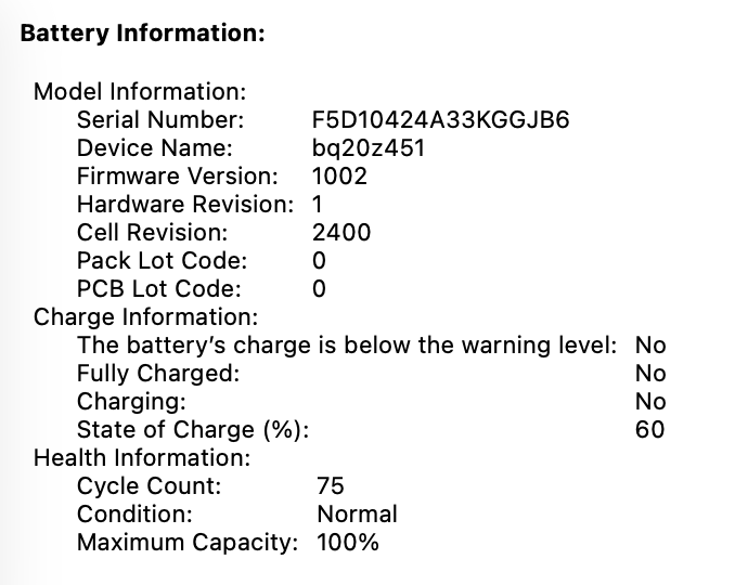 • Battery Health: 100% (only 75 cycles)