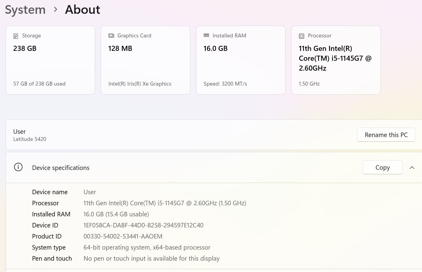 CPU: Intel Core i5-1145G7 2.60GHz