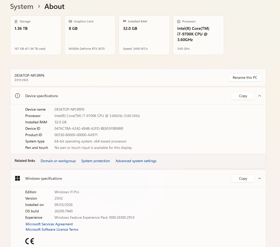 CPU: Intel Core i7-9700K 3.60GHz