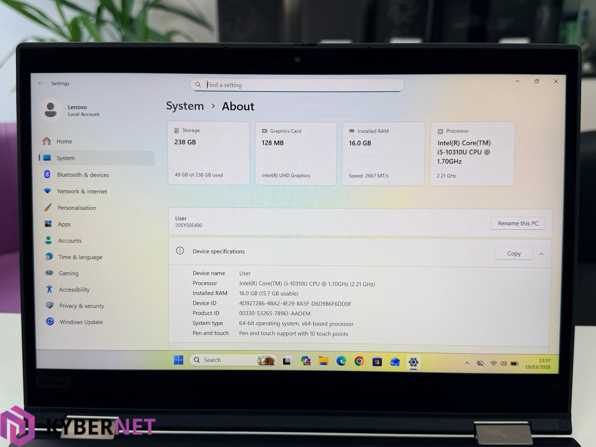 Lenovo ThinkPad X13 Yoga Gen 1 13.3" FHD Touchscreen Laptop, i5-10310U 1.70GHz, 16GB, 256GB