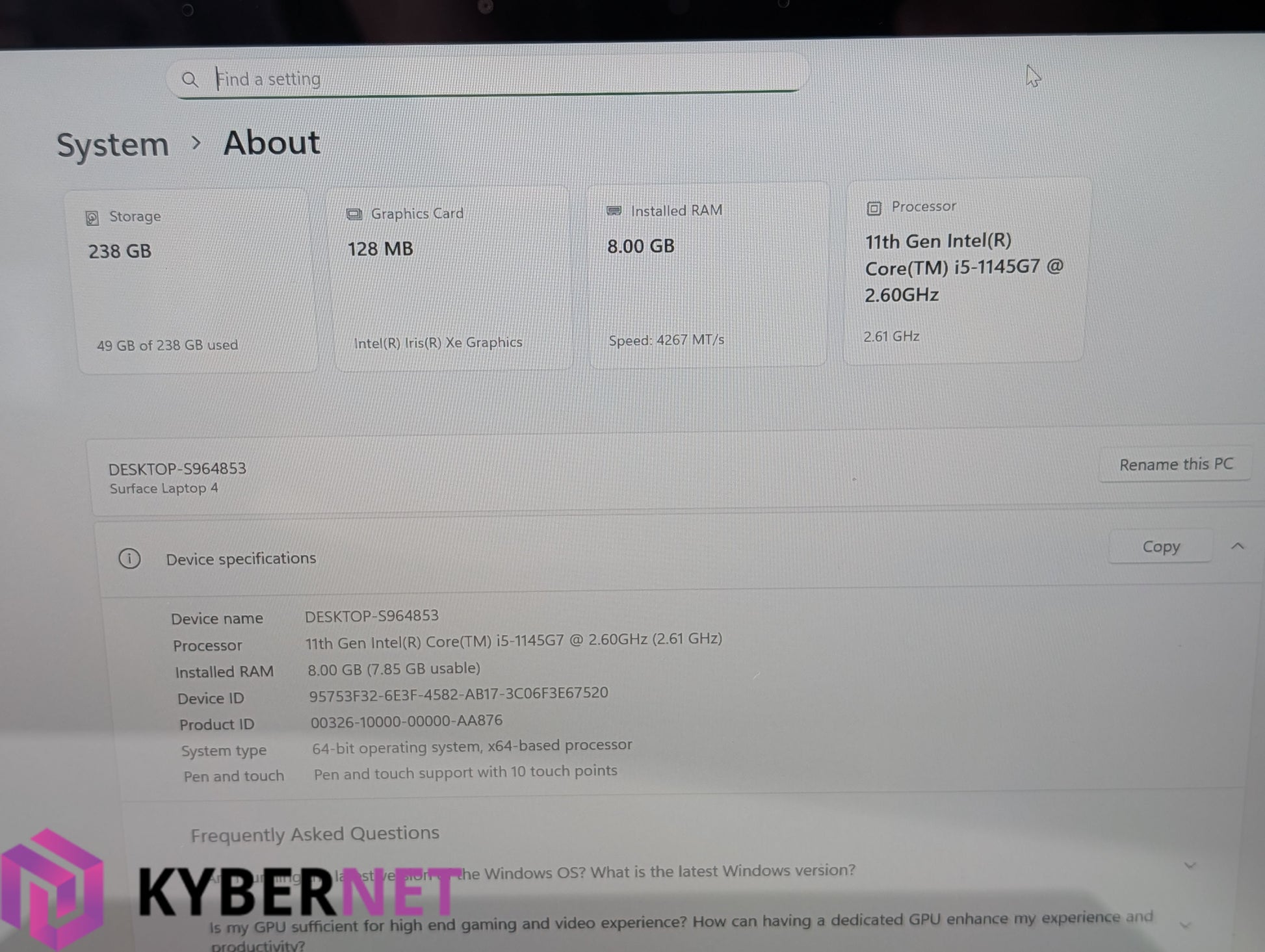 Processor: Intel Core i5-1145G7, 11th Gen, 2.60GHz (Turbo up to 4.4GHz)